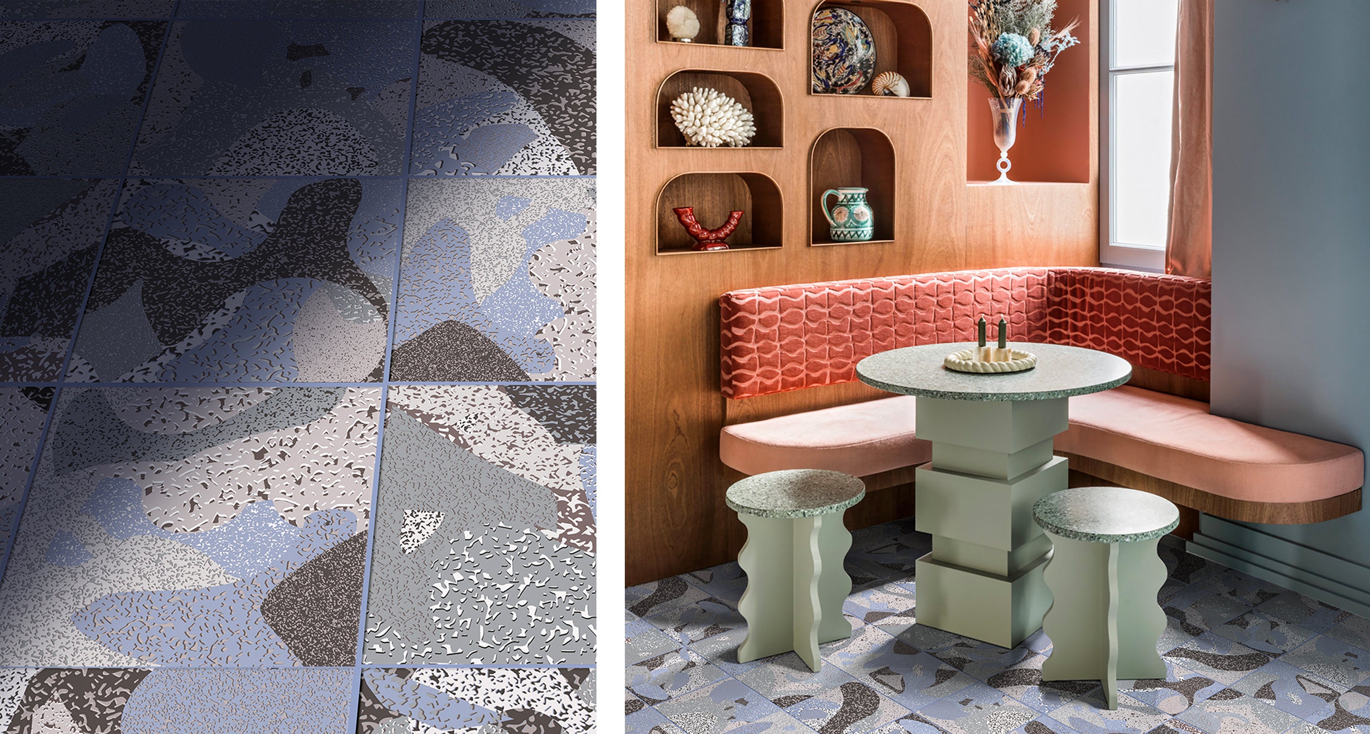 This funky terrazzo is a contemporary approach to a nostalgic, composition notebook motif. Not only is it chic but it hides debris well.