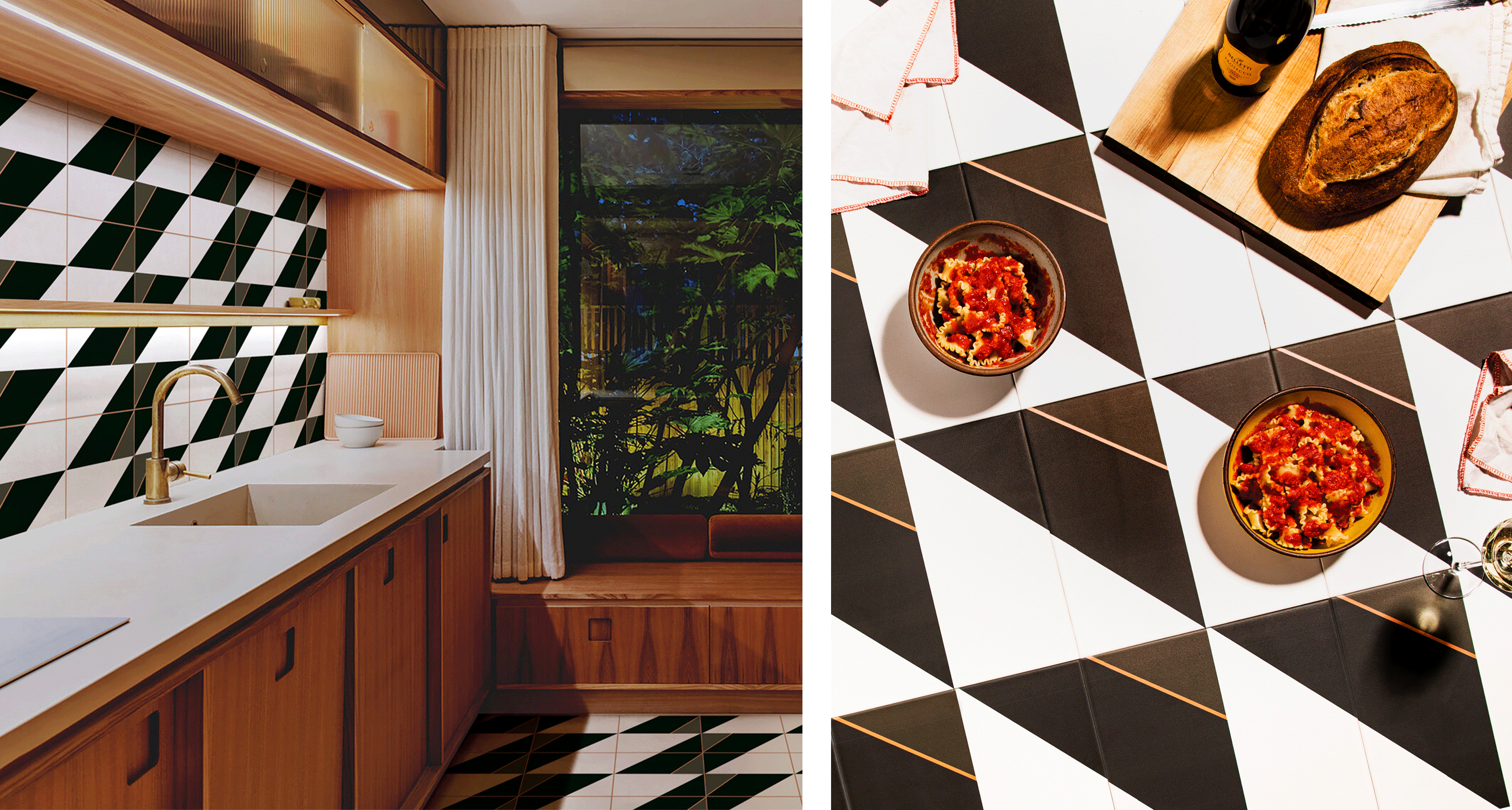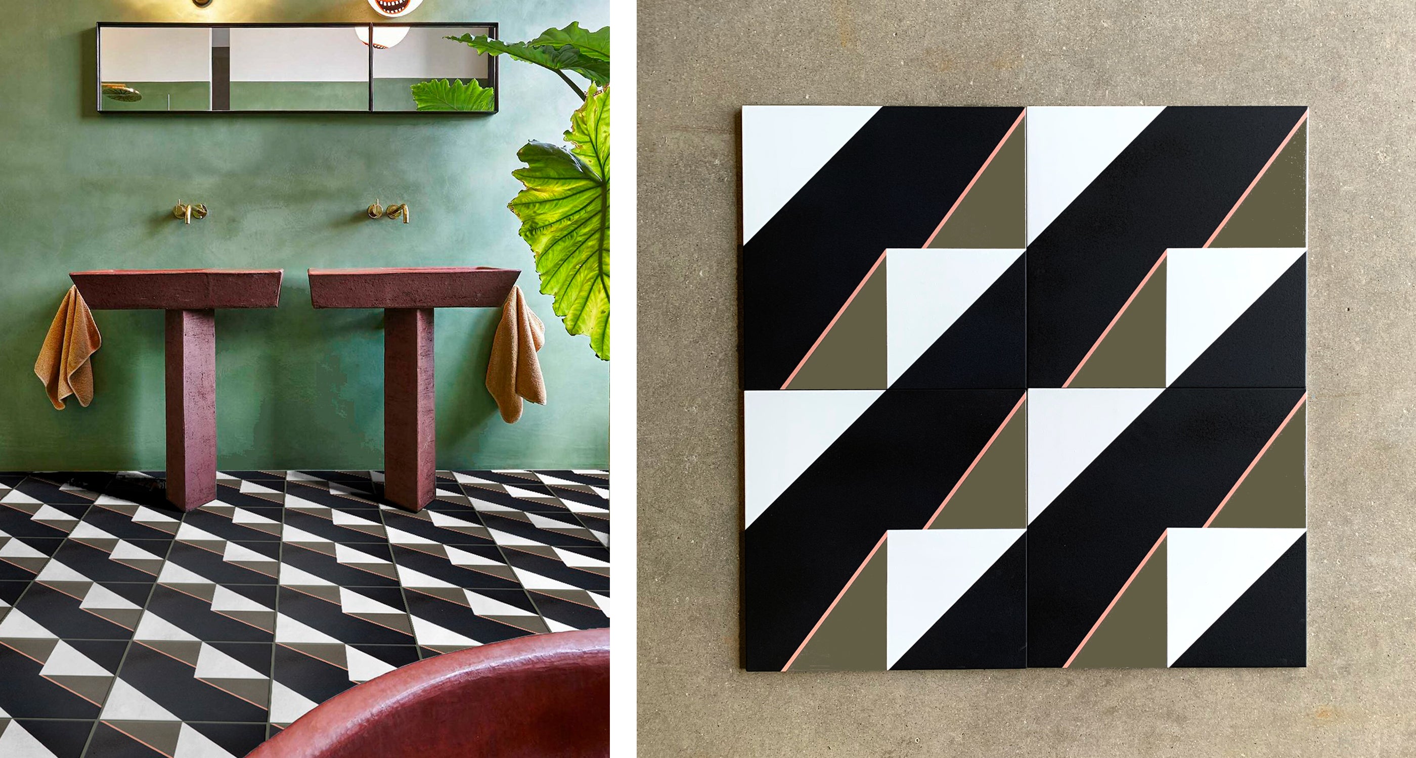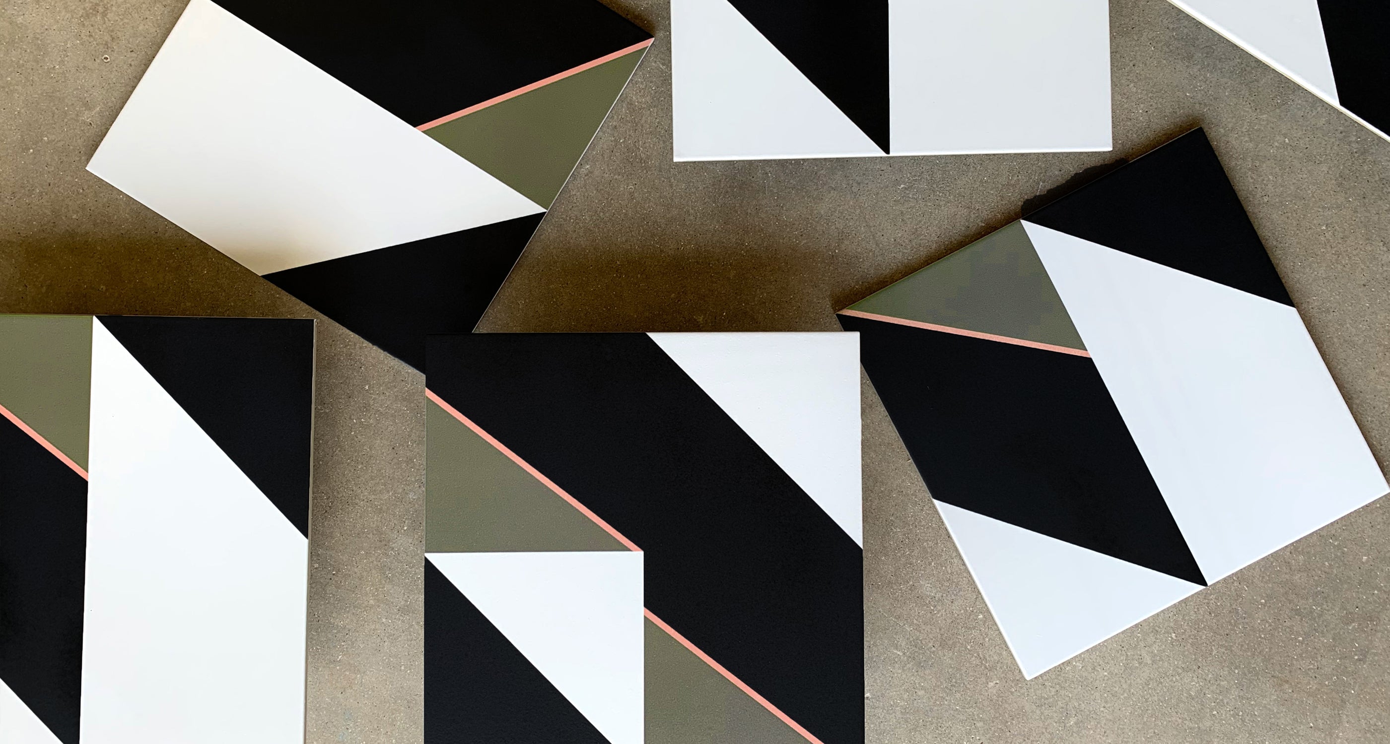 Our HARVEY tile is a fresh take on the timeless black-and-white grid. The simple black, white, and camo greenish brown triangles, with a thin accent of salmon pink, piece together larger triangles when tiles are grouped. It is bold, and crisp, and adds a statement to any floor or wall, inside or outside.